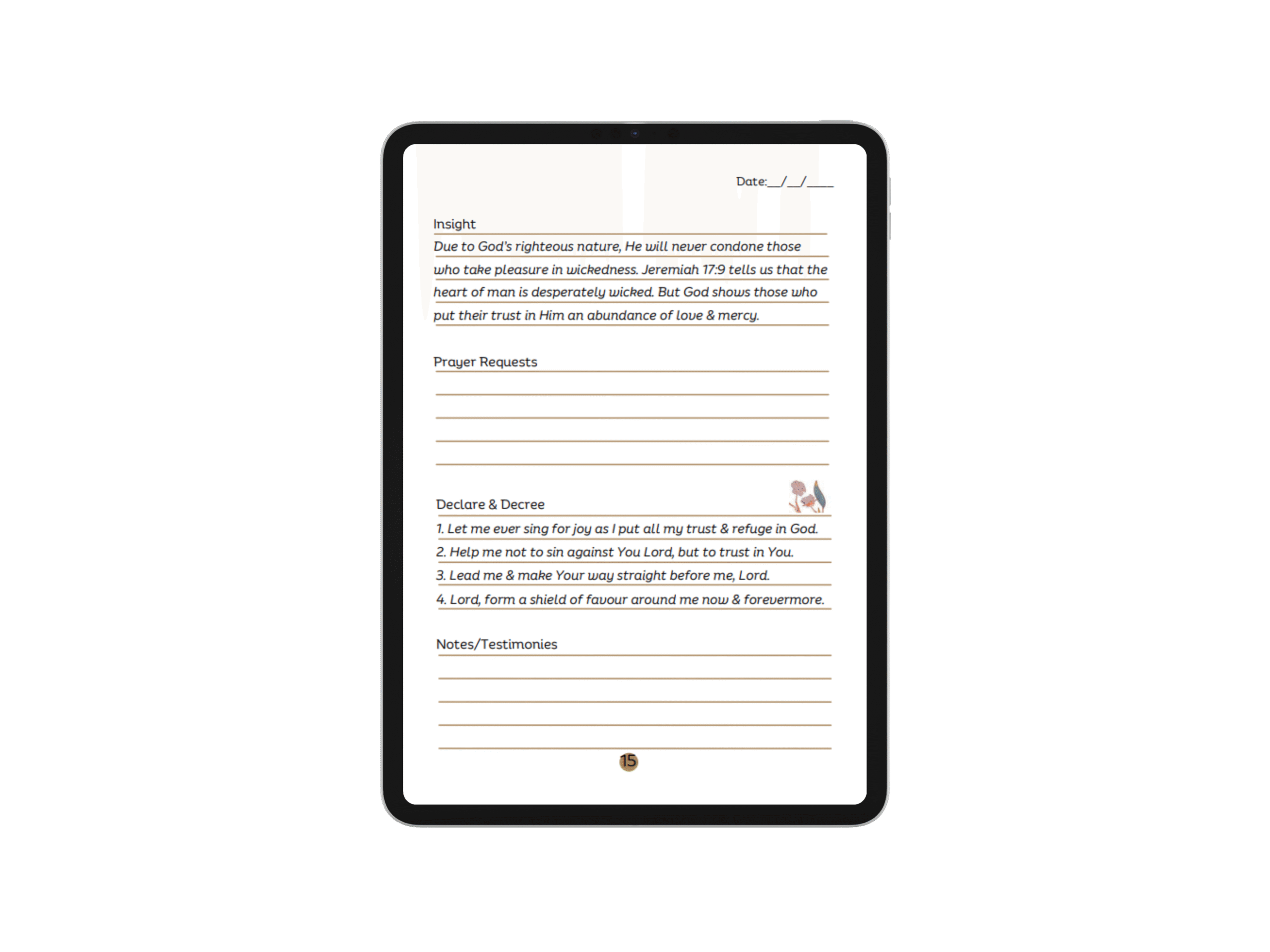 The Spiritual Warfare Prayer Digital Journal is a 50 week devotional and prayer journal for Christian women. The journal is based on scripture with references to various Biblical verses, teachings and principles. The primary focus is the book of Psalms which by revelation is spiritual warfare as experienced by the Psalmist.